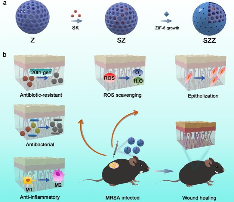 近日,美狮贵宾会姜珂副研究员与精密仪器高等研究中心张玲副教授团队成功研发出食品功能因子递送的新平台——多功能MOF异质结微反应器,在耐药性伤口感染治疗与组织再生领域取得新进展。该成果通过创新异质结微反应器设计与协同治疗机制,显著提升了抗耐药菌与免疫调控性能,解决了传统抗生素治疗中耐药性产生快、免疫失衡及组织修复难的技术瓶颈,为临床复杂感染伤口治疗提供了新思路。